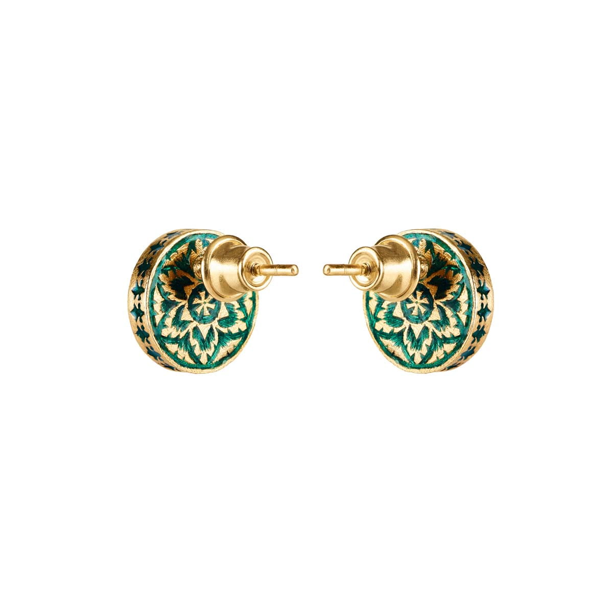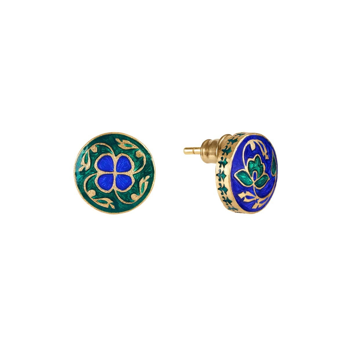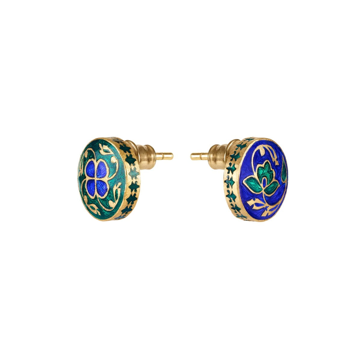 Diese kleinen Ohrstecker sind aus vergoldetem Silber gefertigt und mit Mineralemaille in Grün- und Blautönen verziert. Das Paar ist asymmetrisch. Der erste Ohrring zeigt eine grüne Lotusblume, in der indischen Kultur als Kamal bekannt. Sie ist ein Symbol für Reinheit, Wiedergeburt und spirituelle Erleuchtung. Dieses Motiv wird seit Jahrhunderten auch mit weiblicher Energie in Verbindung gebracht. Der zweite Ohrring zeigt ein zartes Blumenmotiv: eine Blüte und Ranken, die Freude, Wachstum, Fruchtbarkeit und die zeitlose Schönheit der Natur symbolisieren. Grüne Ornamente bedecken auch die Seiten und die Rückseite der Ohrringe und machen den Schmuck aus jedem Blickwinkel atemberaubend. Die Asymmetrie dieses Paares ist kein Zufall; Es verleiht dem Design einen einzigartigen Charakter und macht es zu einem Blickfang.
