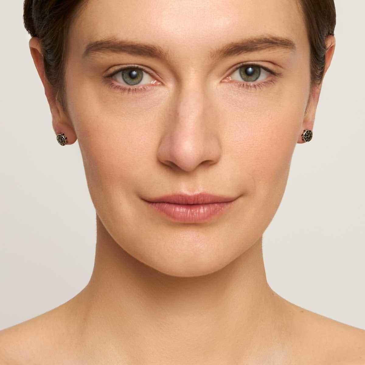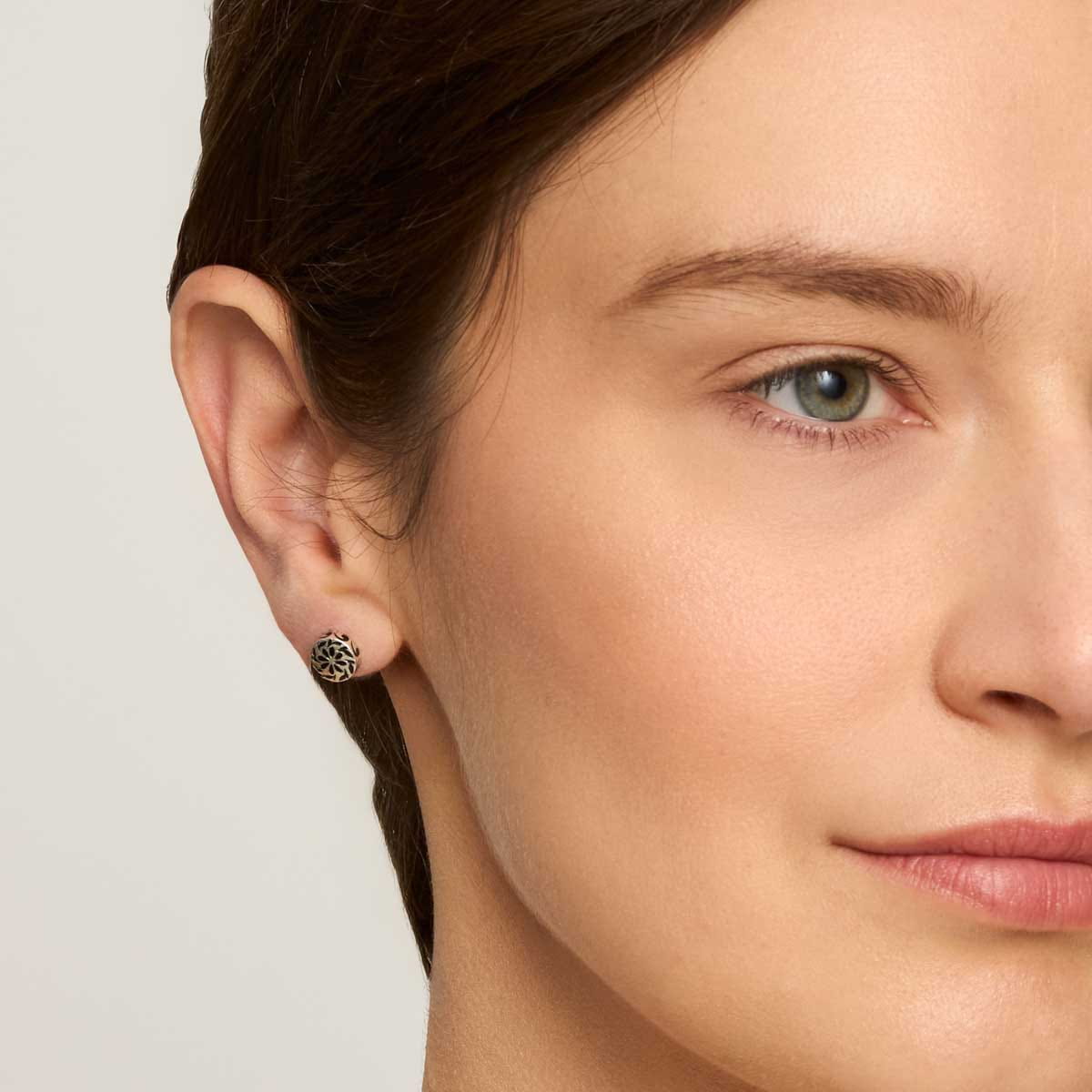 Diese Ohrstecker sind aus Silber gefertigt und mit handgemalten, tiefschwarzen Blumenmotiven verziert. Sie wurden in einer traditionellen Werkstatt in Rajasthan in Minakari-Technik hergestellt. Der Herstellungsprozess beginnt mit dem präzisen Gravieren von Mustern in die Metalloberfläche. Anschließend werden die Schmuckstücke mit farbiger Mineralglasur gefüllt und wiederholt im Ofen gebrannt. Dadurch werden die Verzierungen gehärtet und erhalten intensive, satte Farben. Der Schmuck bewahrt die symbolische Bedeutung der von der Natur inspirierten Motive und Farben, die Kunsthandwerkern seit Jahrhunderten als Quelle des Wissens und als Landkarte der Welt dienen. Mehr über Minakari-Kunst und indische Werkstätten erfahren Sie im Abschnitt „Kunsthandwerk der Welt“.