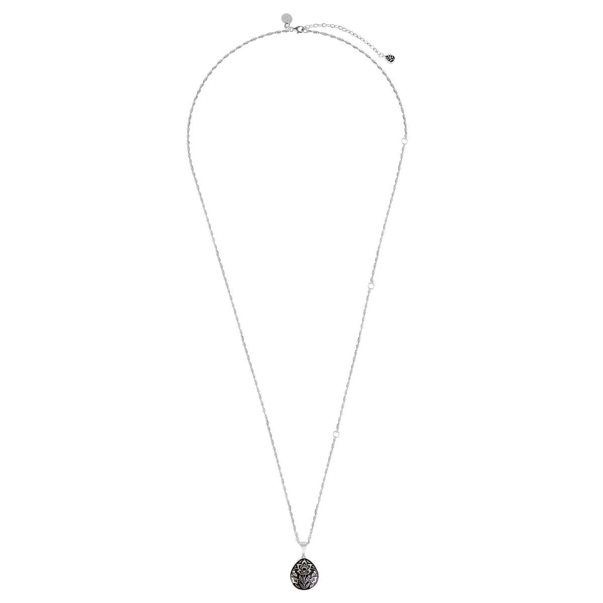 Diese lange, hellsilberne Kette an einer Spirale besticht durch einen tropfenförmigen Anhänger. Der Anhänger ist doppelseitig: Eine Seite ziert ein zentral angeordnetes schwarzes Kundan-Glas, ein traditionelles indisches Glas, umgeben von silbernen und schwarzen Emaille-Verzierungen. Diese Seite wirkt elegant, dezent und geheimnisvoll. Die andere Seite offenbart filigrane, von lokalen Kunsthandwerkern handgefertigte florale Verzierungen: schwarze und silberne Pflanzenornamente. Die Kette kann in verschiedenen Längen getragen werden. Das Schmuckstück verfügt außerdem über eine Verlängerung, die mit einem kleinen Anhänger endet, der beidseitig mit floralen Mustern verziert ist.