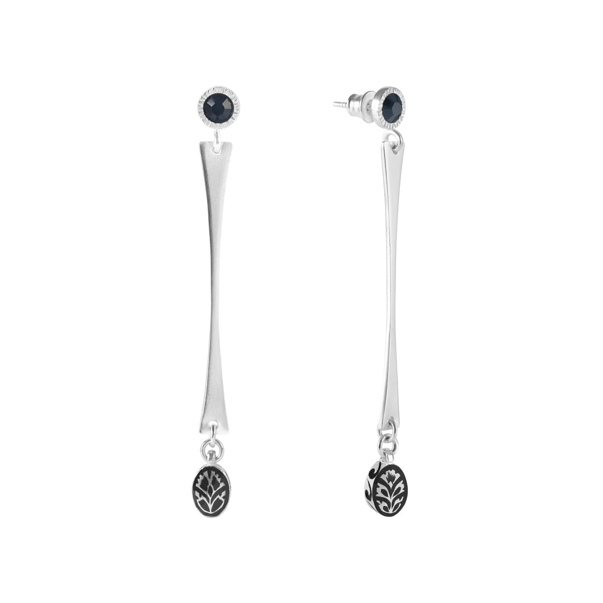 Diese langen Ohrringe sind aus 925er Sterlingsilber gefertigt. Ihr oberer Teil ziert ein kleines, rundes Element mit einem schwarzen Kristall. Darunter hängen geometrische, längliche Formen, die von reich verzierten ovalen Anhängern gekrönt werden. Die Anhänger sind beidseitig mit floralen Motiven aus schwarzer Emaille verziert. Die Ornamente sind asymmetrisch angeordnet, wobei jedes Ohrring ein anderes florales Muster zeigt, was den Ohrringen ein einzigartiges Aussehen verleiht. Alle Verzierungen wurden in einer indischen Werkstatt handgefertigt, deren Besitzer die Designerin auf ihren Reisen kennengelernt hat. Die Asymmetrie der Ornamente verweist auf die persische Handwerkstradition, in der kleine Unvollkommenheiten ein bewusstes Element der Arbeit sind. Dem Glauben nach kann nur das Göttliche vollkommen sein, daher hinterlässt der Schöpfer Spuren menschlicher Unvollkommenheit in seinem Werk.