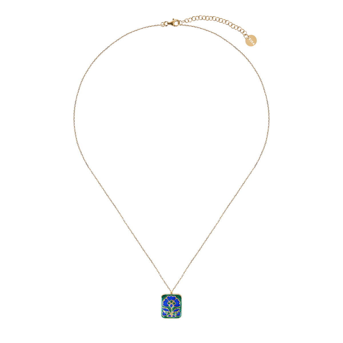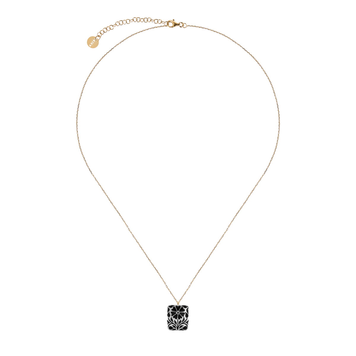 Diese Halskette an einer zarten Kette ist aus vergoldetem Silber gefertigt. Ihr zentrales Element ist ein doppelseitiger Anhänger, reich verziert mit Mineralemaille. Eine Seite zeigt eine schwarze Ringelblume auf silbernem Grund und bildet so eine elegante, zurückhaltende Komposition. Auf der Rückseite verleiht eine intensiv blaue Clitoria-Blüte, umrahmt von grüner Emaille, dem Schmuckstück einen unverwechselbaren, frischen Charakter. Dekorative Verzierungen schmücken auch die Ränder des Anhängers – schwarze Ranken sind auf die vergoldete Oberfläche gemalt und winden sich um die Form als Symbol für beständige, ewige Verbundenheit.