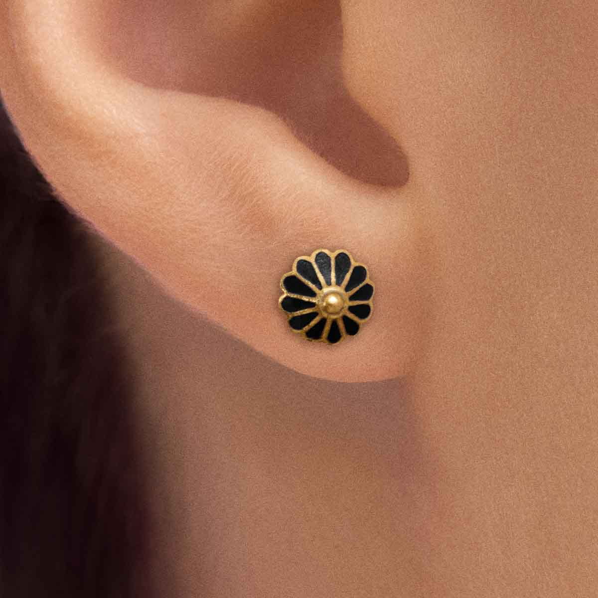Diese zarten Ohrstecker werden in Rajasthan aus vergoldetem Silber handgefertigt und sind zu dekorativen Rosetten geformt. Vom goldenen Zentrum aus breiten sich schwarze, handbemalte Muster aus Mineralglasur aus, die an Blütenblätter erinnern. In der persischen und indischen Kultur symbolisiert die Rosette die Ordnung des Universums – ihre geometrische Form spiegelt die Harmonie des Kosmos und die natürlichen Zyklen des Lebens wider. Schwarz hingegen symbolisiert Tiefe, Eleganz und eine Stärke, die keiner Zurschaustellung bedarf. Es erinnert uns daran, dass das Wesentliche oft im Verborgenen bleibt – nur für diejenigen zugänglich, die genau hinsehen.
